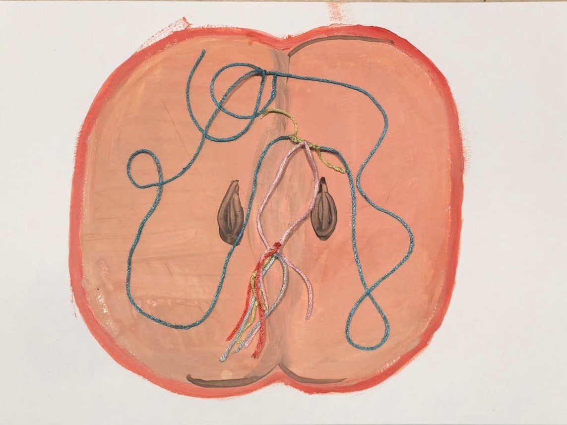 Следующий этап — создание из нитки уникального украшения. Это может быть любое изделие, созданное путем завязывания, плетения или даже разрывания нитей. Затем полученный объект помещается в центр листа, а вокруг создается некий эстетический контейнер — форма, которая может быть любой: от шара до половинки яблока.