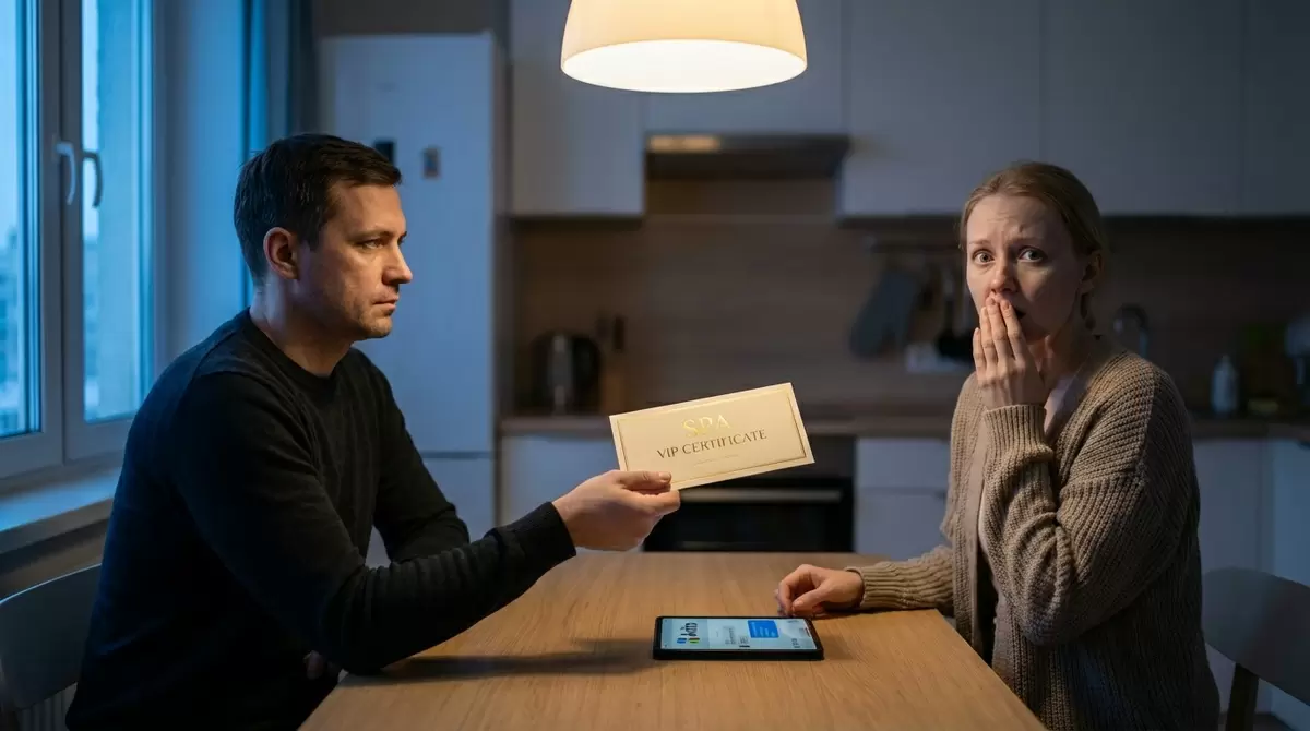 Кто бы мог подумать, что безлимитный spa-абонемент станет поводом для семейного кризиса? История, которая вскрыла грязные тайны и жадность, начала разворачиваться на кухне, когда главный герой, сидя с холодным чаем, обнаружил в конверте дорогой подарок для своей жены. Это был годовой безлимит в самом престижном салоне города — "Royal Thai & Spa". Не зная, что этот жест был сделан ее богатым любовником, он заплатил за него целых 300 000 рублей через объявление на Авито.